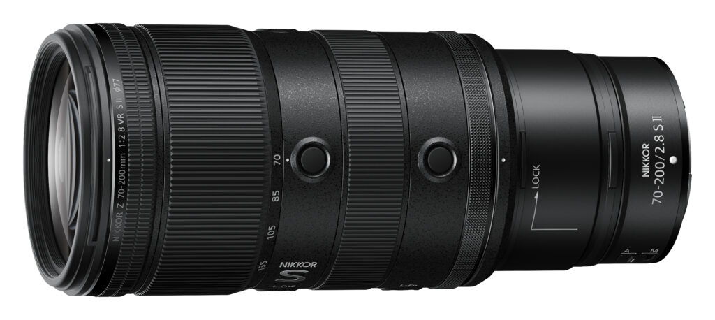 「NIKKOR Z 70-200mm f/2.8 VR S II」は、NIKKOR Z レンズの「S-Line」に属し、クラス最軽量の質量約998gを実現した、70-200mmの焦点距離全域を開放F値2.8一定でカバーする望遠ズームレンズ。