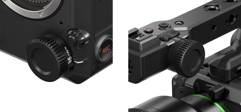 ・カメラ前面部と同梱ハンドルにフジノンGマウントレンズの「フォーカス」「ズーム」「アイリス」がコントロール可能な「マルチファンクションダイヤル」を配置。また設定を「ND」にするとダイヤルコントロールによる「電子式可変NDフィルター」の緻密な濃度調整が可能。