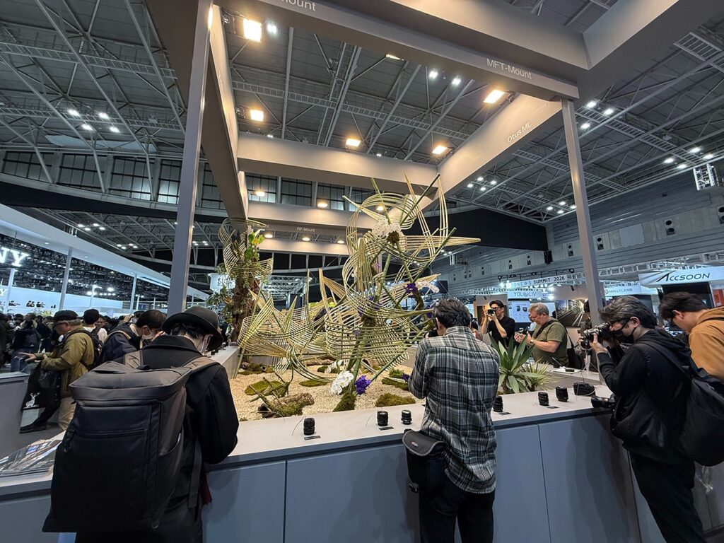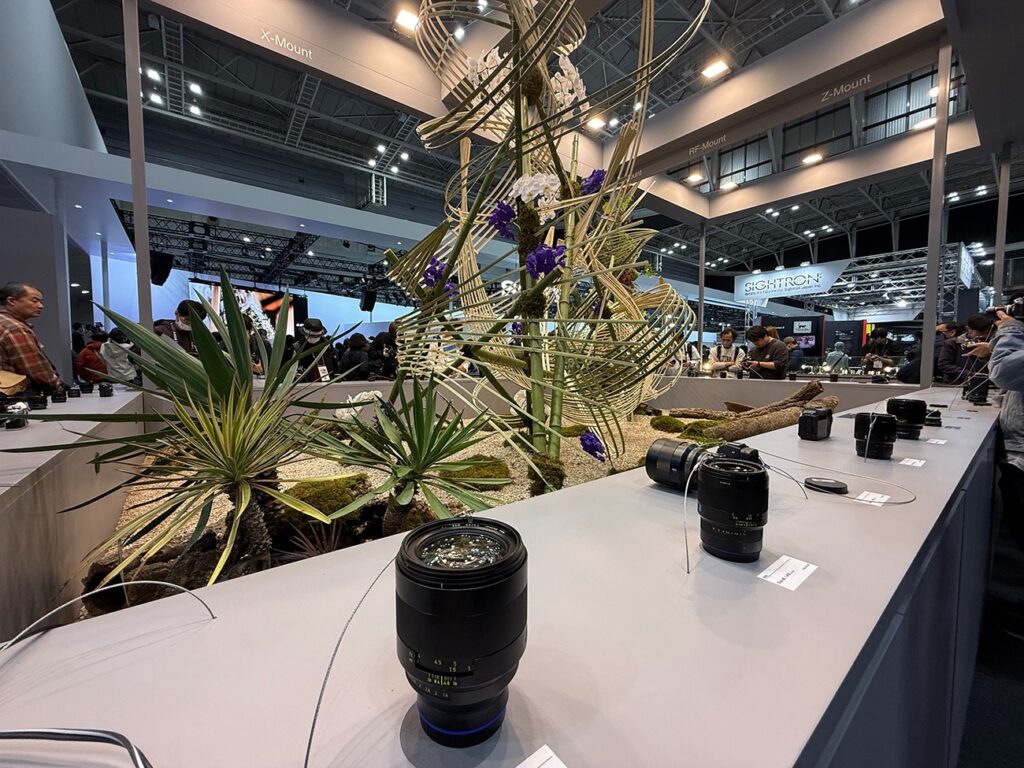 グレーを基調とした端正な構造はコシナのブースだ。その中央には、竹を用いた和のオブジェが配され、空間全体に落ち着いたリズムを与えている。