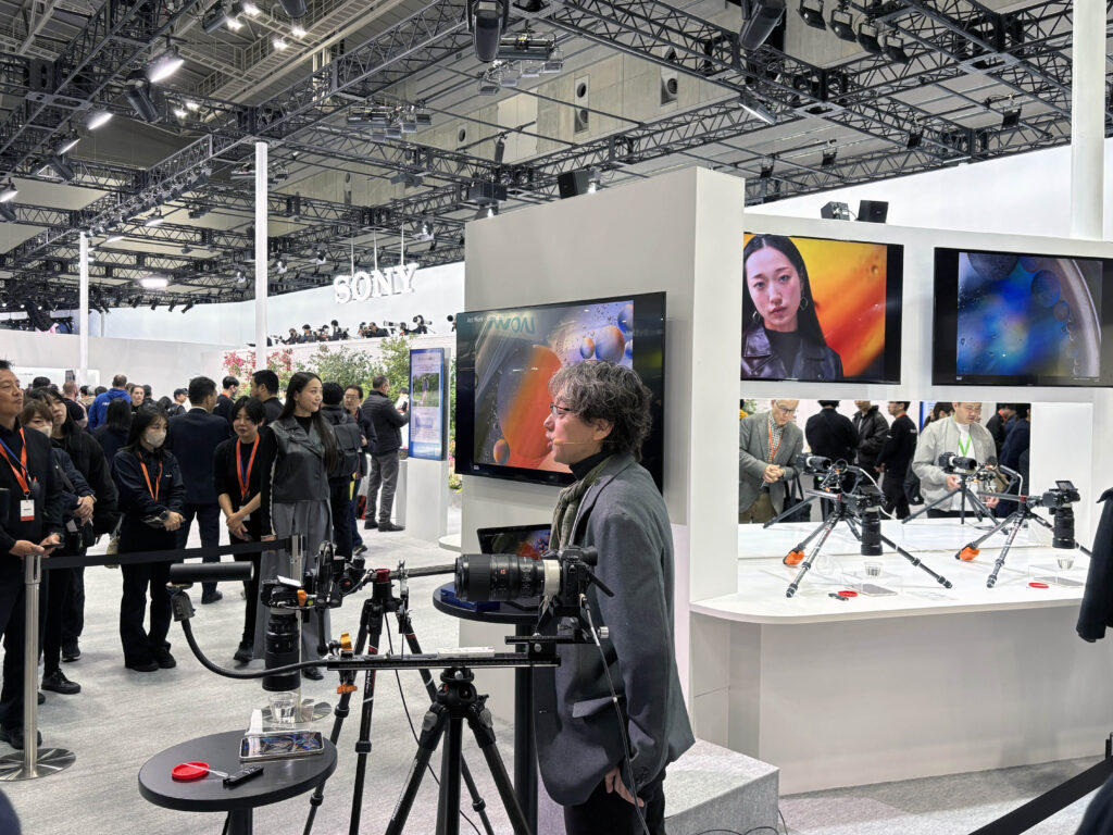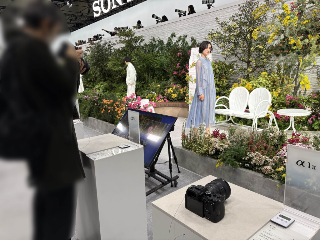 フラッグシップモデル「α1II」や「RX1RIII」、Cinema Lineカメラ「FX2」やGマスターレンズ群などの製品がずらりと並ぶ姿は壮観。