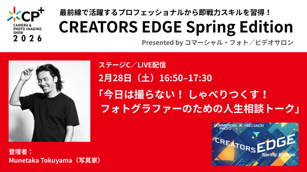 CP+(シーピープラス)2026の中で、玄光社の2誌『コマーシャル・フォト』『ビデオサロン』が、写真・映像クリエイターに向けた実践型イベント「CREATORS EDGE Spring Edition」を開催する。