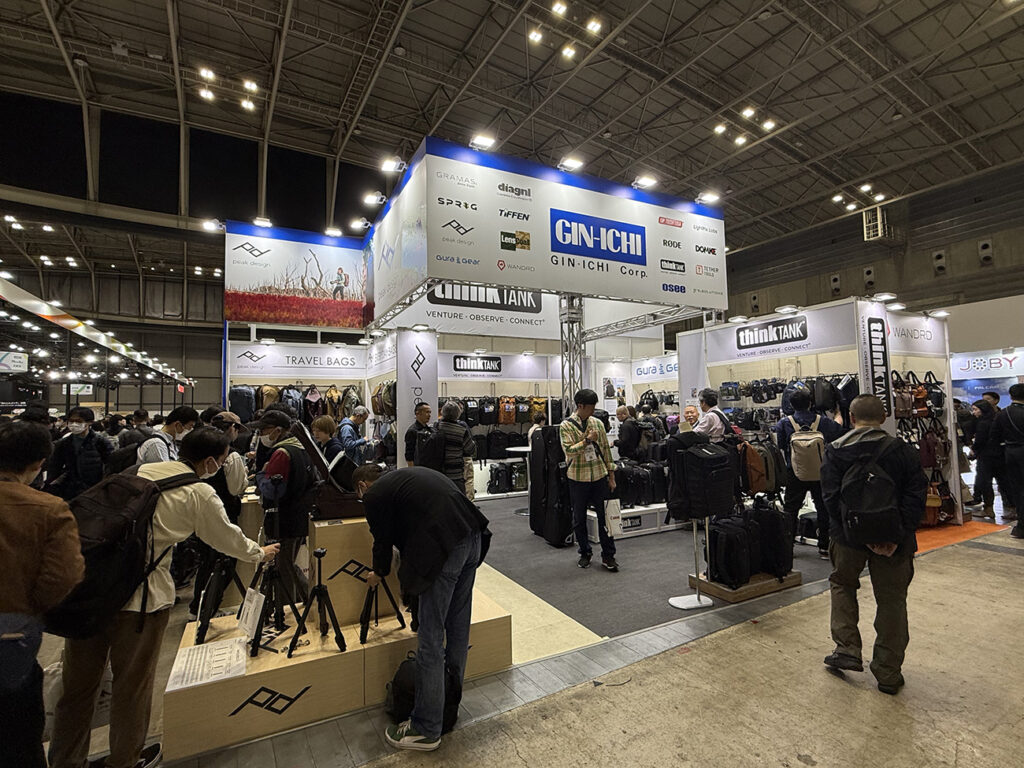 カメラバッグ、三脚、ケーブル、ライティング機材など、撮影現場を支えるアクセサリが並ぶ。