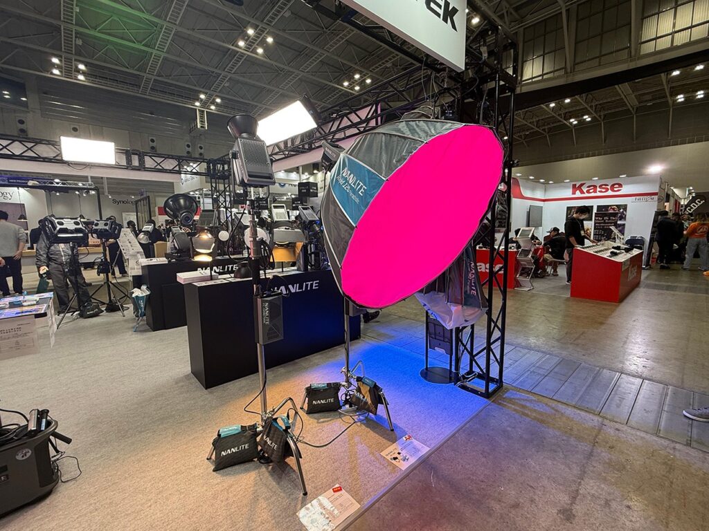 黒を基調としたフレーム構造のブースには、大小さまざまなLEDライトが立体的に配置されていた。天井トラスにはスポットタイプの高出力機が並び、壁面にはカラフルなチューブライトが縦に整列。面光源、スポット光、アクセント光が同時に視界へ入り込む構成で、“光の選択肢”そのものを見せる空間になっている。