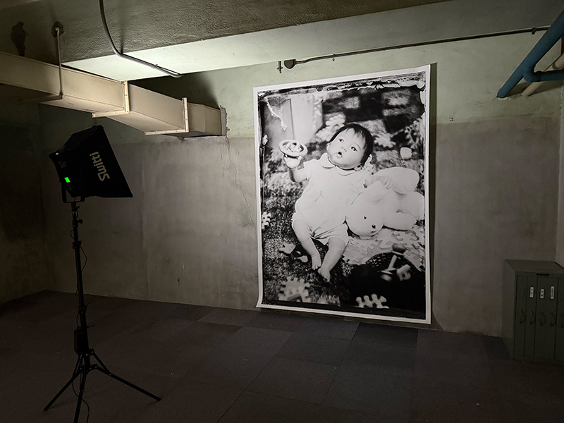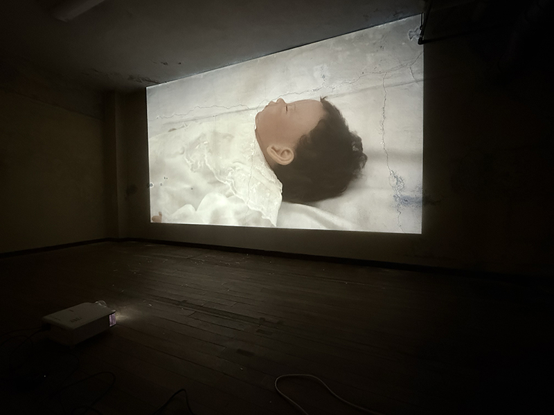 1階で受付をすませ、階段を降り、展示空間に足を踏み入れると、最初に目に入ってくるのは薄暗い部屋に投影された映像。そこには眠るかわいらしい赤ん坊の姿。