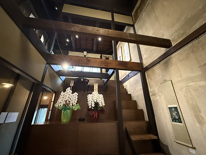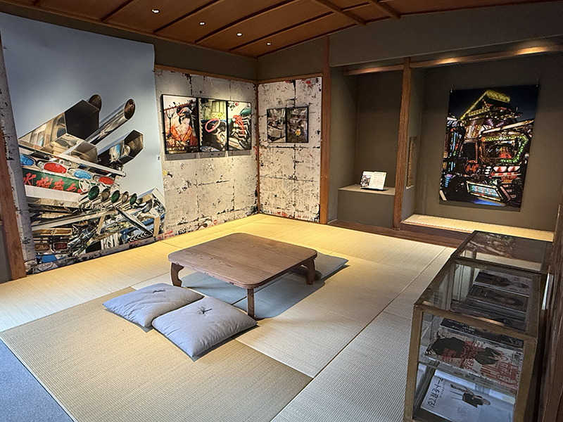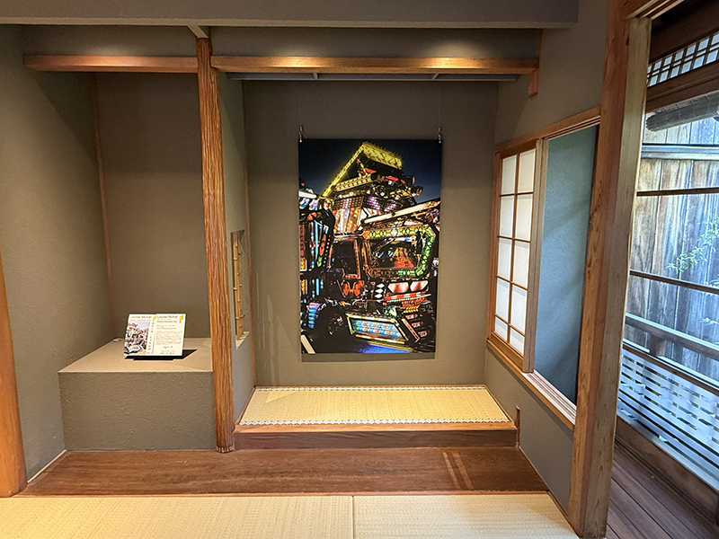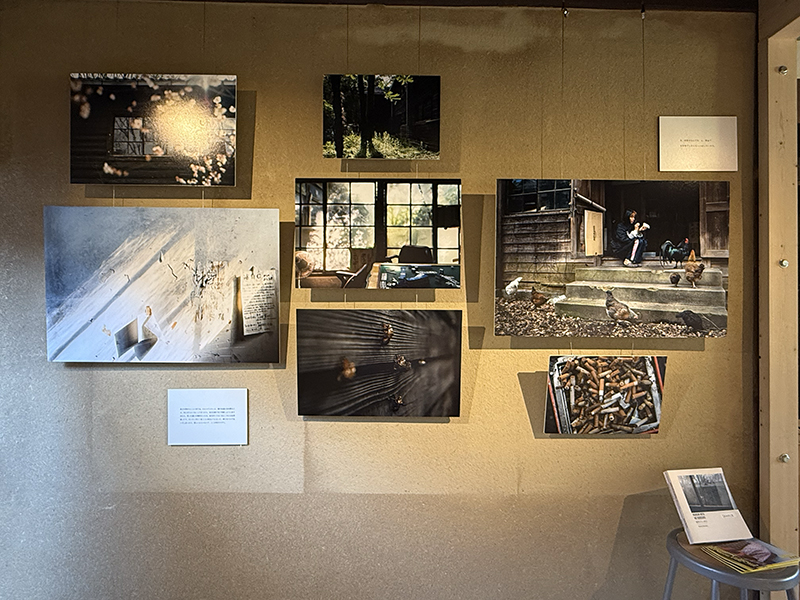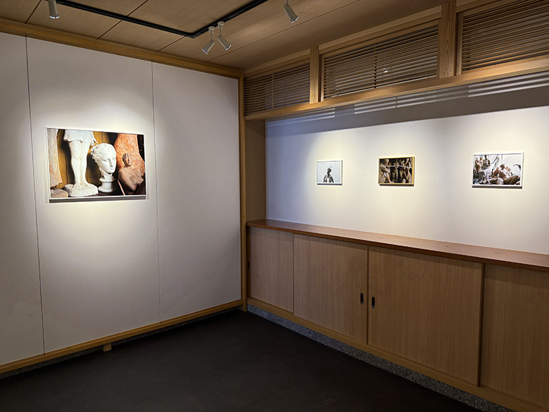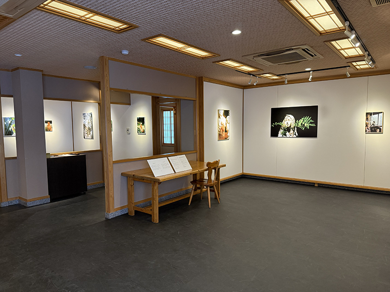 土壁や梁など、日本の伝統的な建築要素が残る室内と写真作品が調和していた。