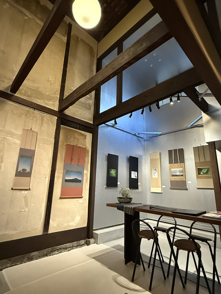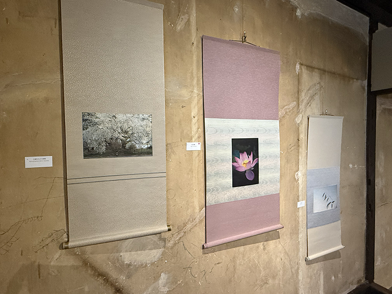 古民家を改装した趣のある空間に、風景写真や自然のモチーフを中心とした作品が、掛軸形式で展示されている。