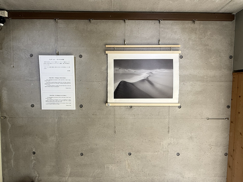 砂漠の風景をモノクロで撮影し、伊勢和紙にインクジェット、プラチナプリントでそれぞれプリント。砂漠や岩などの乾いたテクスチャーと和紙との相性の良さにハッとさせられる。