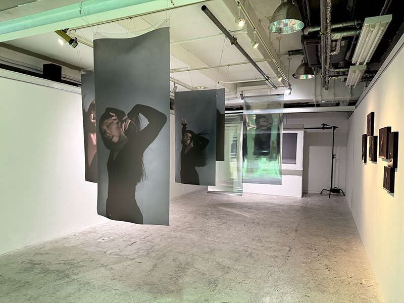 武藤健二による「Dialogue」は、女性のダイナミックな動きを写真で捉えている。会場中央の天から吊るされた作品が揺れ、展示空間に動きを与えている。