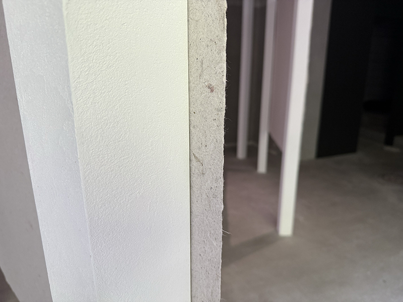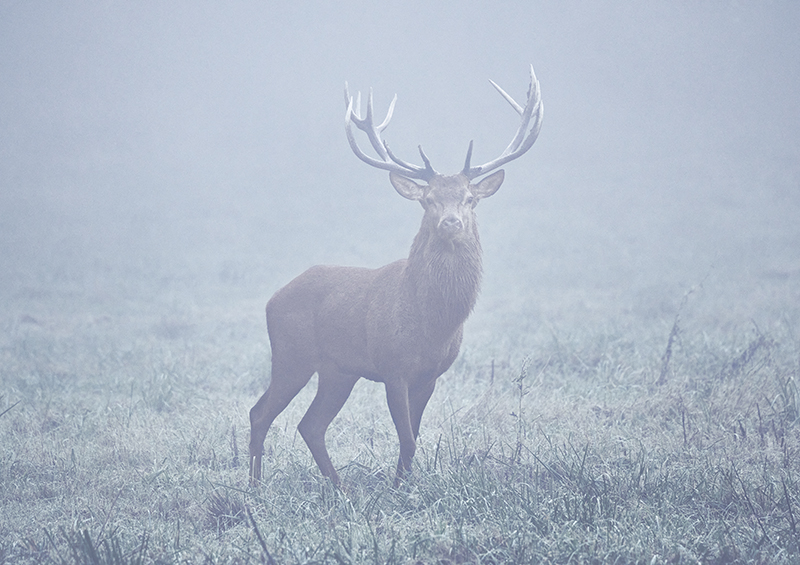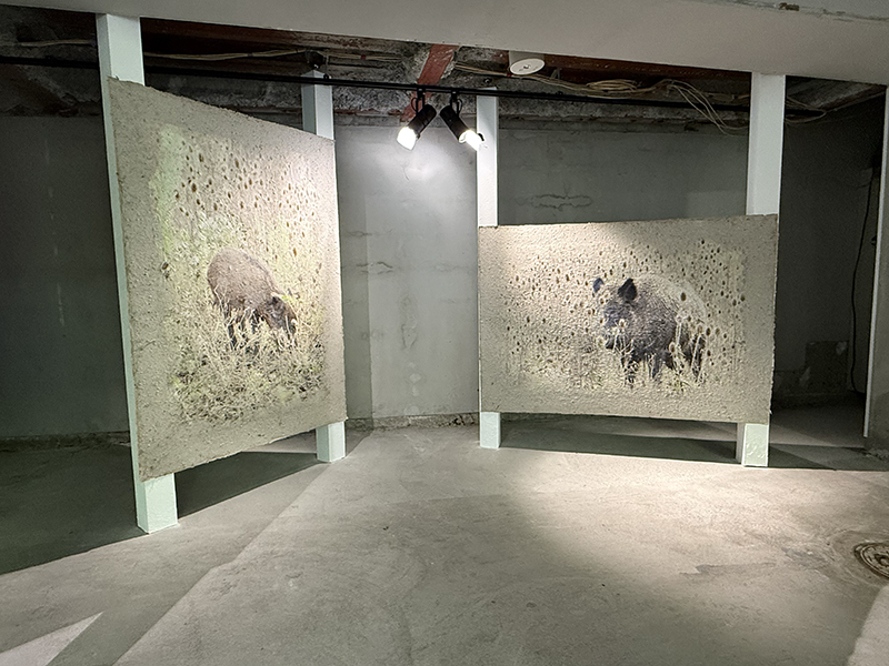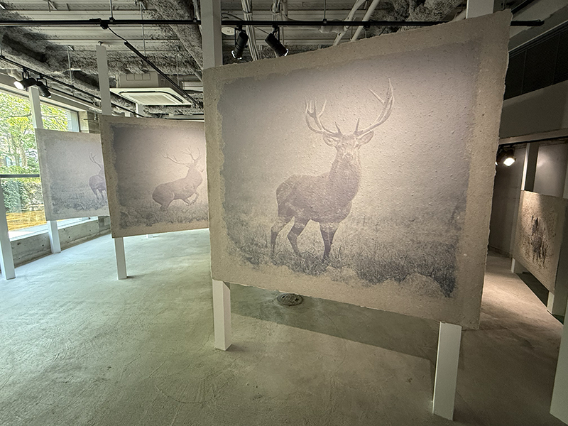 その後、次の部屋では自然光が差し込む空間へ。そこに立ち現れるのは、霧の中に佇む雄鹿の写真。滞在の終わりに偶然出会った鹿だそうだが、どこか幻のような佇まいで、静かな余韻を残してくれる。これらの写真は自ら漉いた和紙が用いられているという。