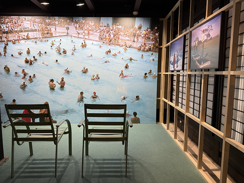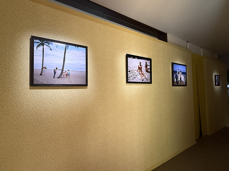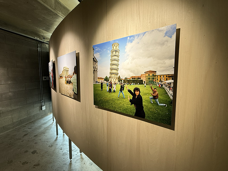 展示作品では、世界遺産の前でポーズを取る団体観光客や、ピサの斜塔をトリックアート的に“手で支える”あるあるな構図、人工プールに密集する人々など、観光という行為そのものを捉えた写真がずらりと並ぶ。思わず笑ってしまう光景の中に、「観光とは何だろう?」という疑問が生まれる。