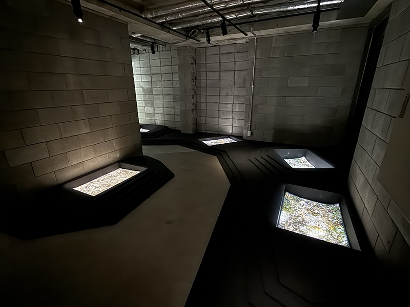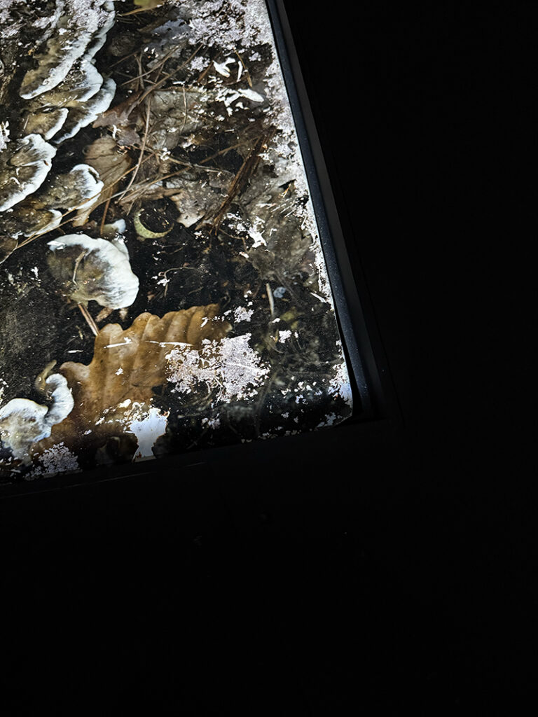 展示室に足を踏み入れると、壁や床に写真が点在し、暗がりの中スポットライトによって静かに浮かび上がる。目を凝らすと、写真には土の上に落ちた葉、木の実、きのこ、虫、動物の痕跡…、生命が朽ち、やがて土へと還り、それがまた新たな命を育む自然の循環が写し出されている。