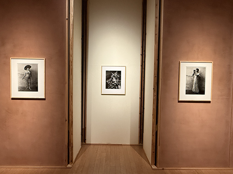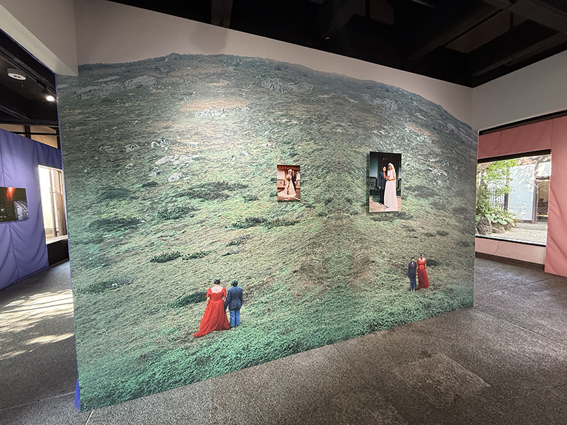 展示会場は重厚な空間に設えられた曲線的な壁によって構成され、ひとつの物語の中に入り込んだかのような空間演出が印象的。強い色の壁面やフレーム、額装が作品を引き立て、絵画のように語りかけてくれる。