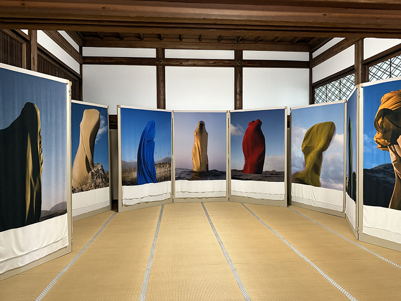 展示空間の作品には、鮮やかな色彩の大きな布をまとった「何か」が登場する。布が風にたなびきそびえ立つ姿は厳かな雰囲気を漂わせている。霊(たましい)の姿を表しているという。