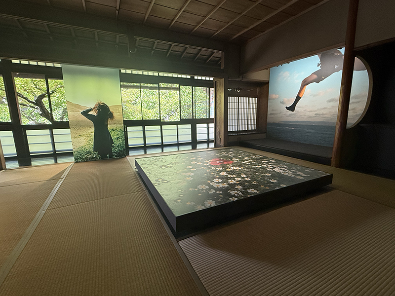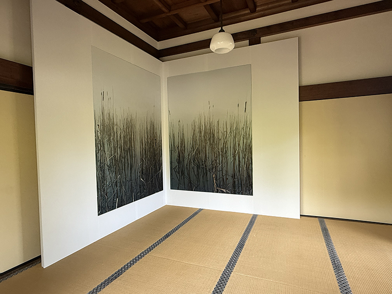 森や朽ちていく植物が、襖にプリントされていて建物の雰囲気と違和感なくマッチしている。什器は使わず、本来の姿をできるだけ活かした展示スタイルのようだ。
