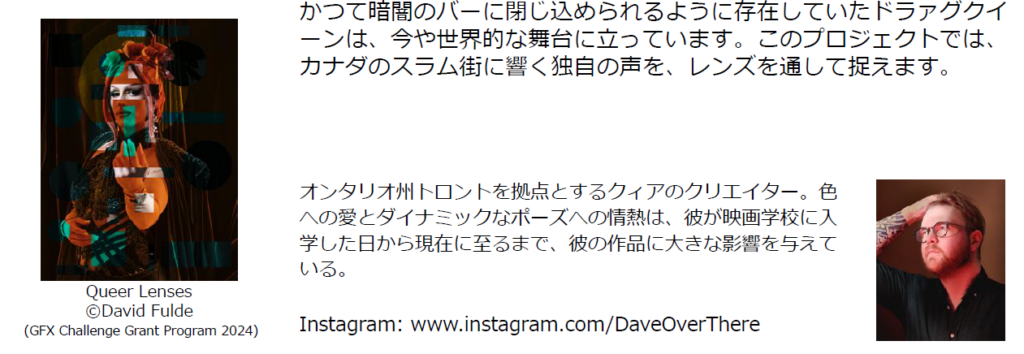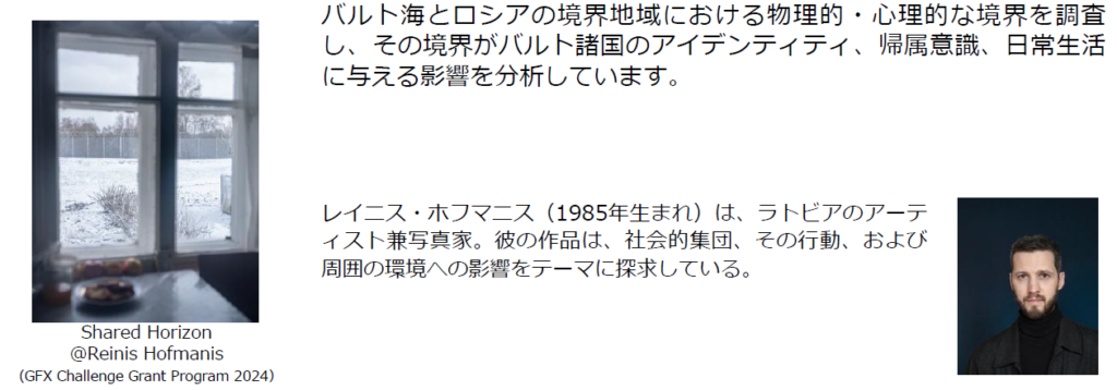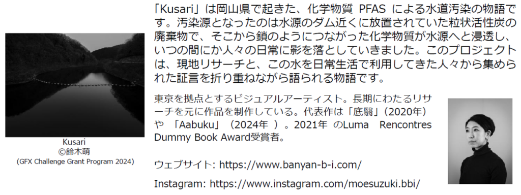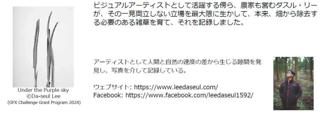 本展では、「GFX Challenge Grant Program 2024」を通じて制作された受賞者15名の作品を一堂に展示いたします。世界各国から集まったオリジナリティあふれる写真・映像作品を楽しむことができる。