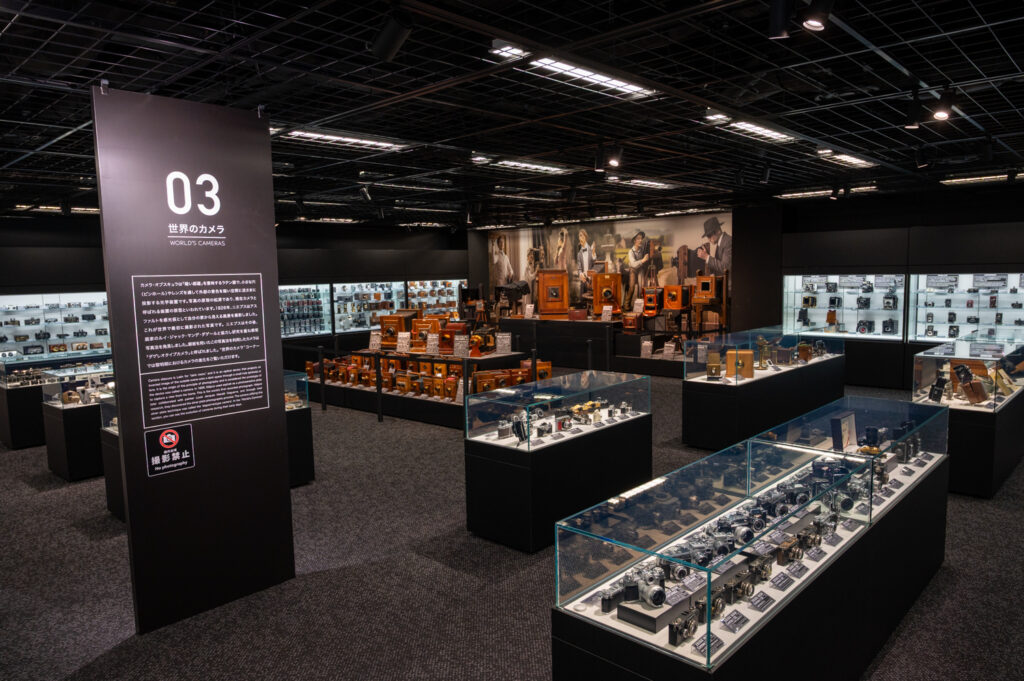 ミュージアム全体では約1,000台のカメラが展示。キヤノン、ニコン、ソニーなど、最新のデジタルカメラはもちろん、フィルムカメラ、中判カメラなど、国内勢の製品もそろっている。奥の壁にはヨドバシカメラの歴史が貼ってあったり、カメラの展示にはギミックが施されていたりと、その点にも注目だ。