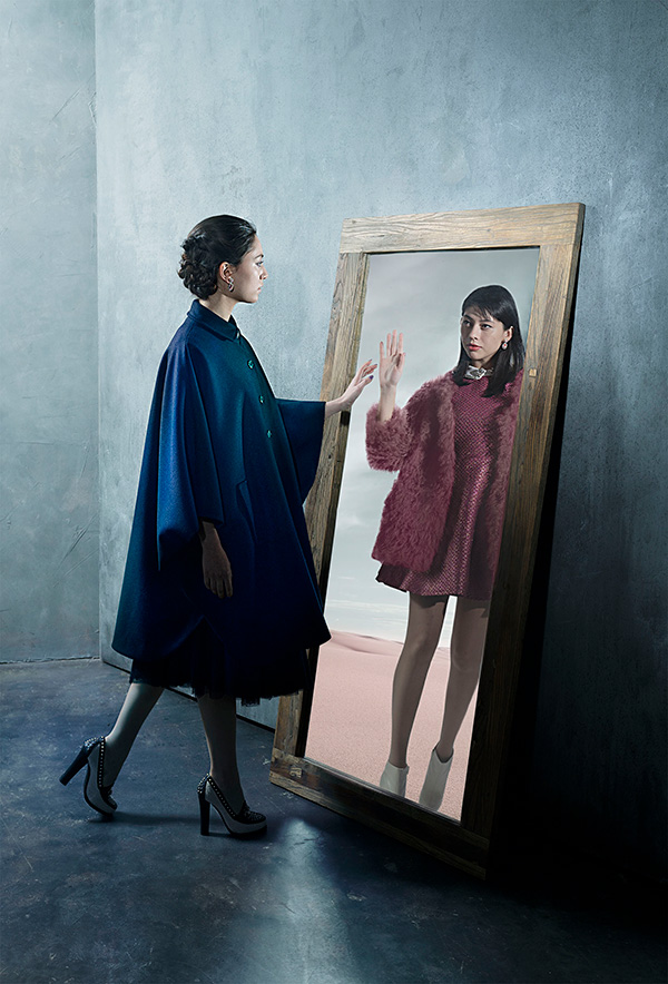 それでは、まずはじめに目元から見ていきたいと思いますが、本題に入る前に下の画像を見てください。今回の連載のためにヴォンズ・ピクチャーズで制作した撮り下ろし作品です。鏡の中に自分とは違う女性の姿を見つけて、それを主人公の女の子が追いかけていくという物語になっています。