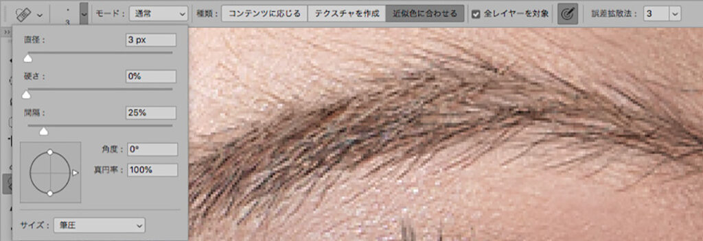 エアブラシの設定は、データサイズによりますが、直径や硬さが眉毛の毛になじむか試しながら進めます(今回は直径 2pix・硬さは0%)。本物の眉毛になじむように、流量も試しながら進めます。