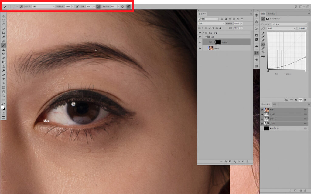 眉毛のムラは、暗めトーンカーブを作成してエアブラシで本当に眉毛を描くように1本1本書き足していきます。