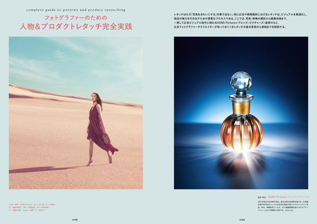 「ビューティ」「ポートレイト」「スチルライフ」「シズル」4 テーマの撮り下ろし作品をそれぞれ制作過程と合わせて紹介します。また、後半ではフォトグラファーが自身でレタッチを行なう際に必要なテクニックや、理解しておくべきレタッチの基礎知識をVONS Picturesに解説してもらいました。