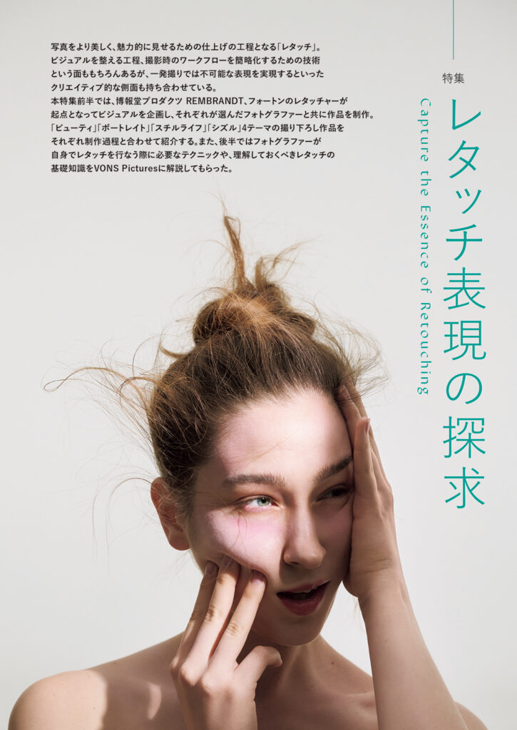 本特集前半では、博報堂プロダクツ REMBRANDT、フォートンのレタッチャーが起点となってビジュアルを企画し、それぞれが選んだフォトグラファーと共に作品を制作。