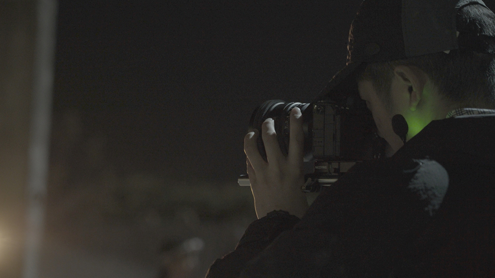 上のカットも、ライトは背景にあるわずかな環境光のみ。臨場感を出すために2人には実際に歩いてもらい、僕は後ろ歩きをしながら手持ちで撮っています。