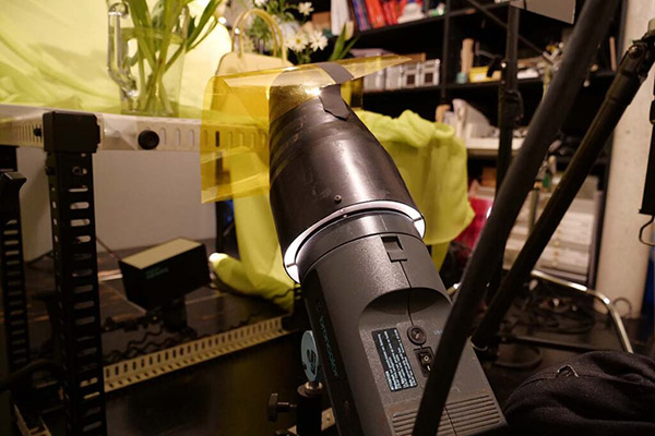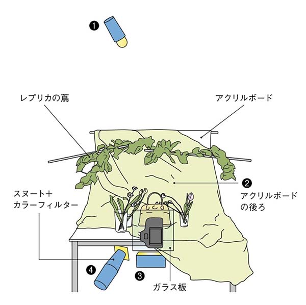 布地の透明感を出す。ライト❹はスヌートにイエローのカラーフィルターをつけ、