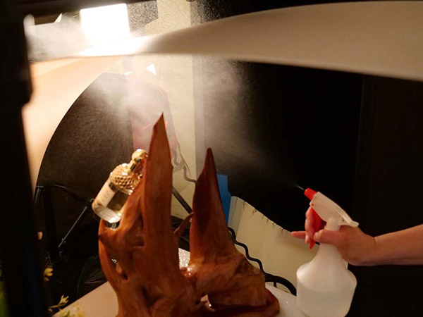 ライトのセッティングはこれで完成だが、商品背後に霧を吹くと、