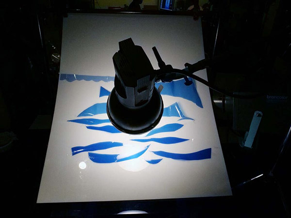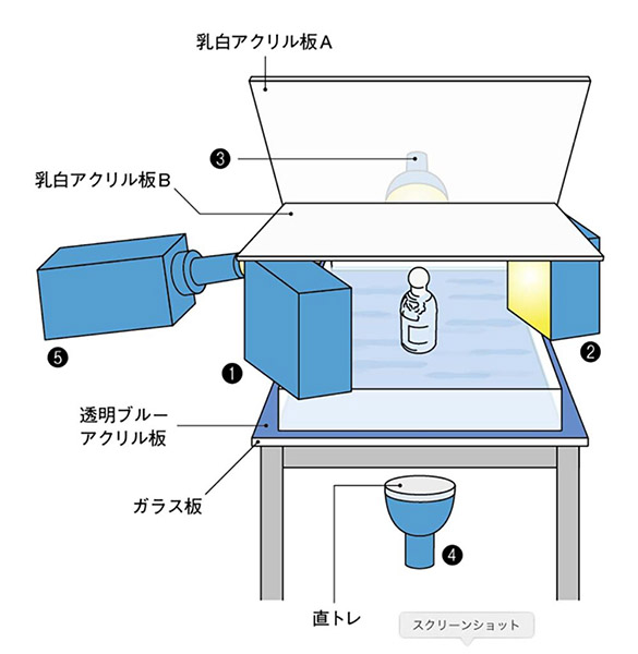 透過光用撮影台には透明アクリルと乳白アクリルを重ね、下からライトを入れている。
