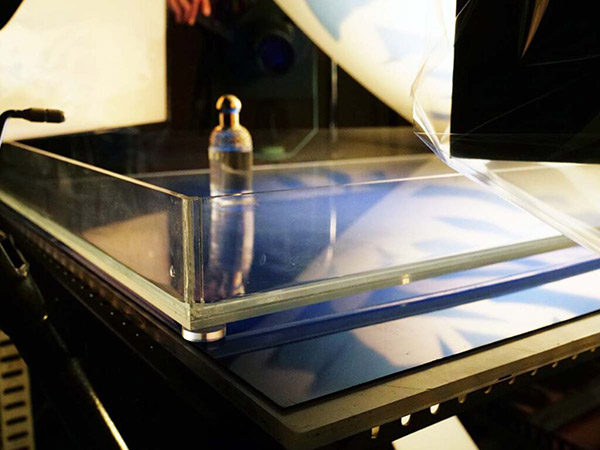 ボトル内部が明るくなると同時に、被写体上の乳白アクリルに反射して、