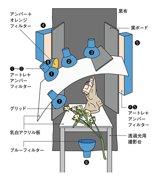 さらにグリッドをつけたライト❼を手前の花にあてる。