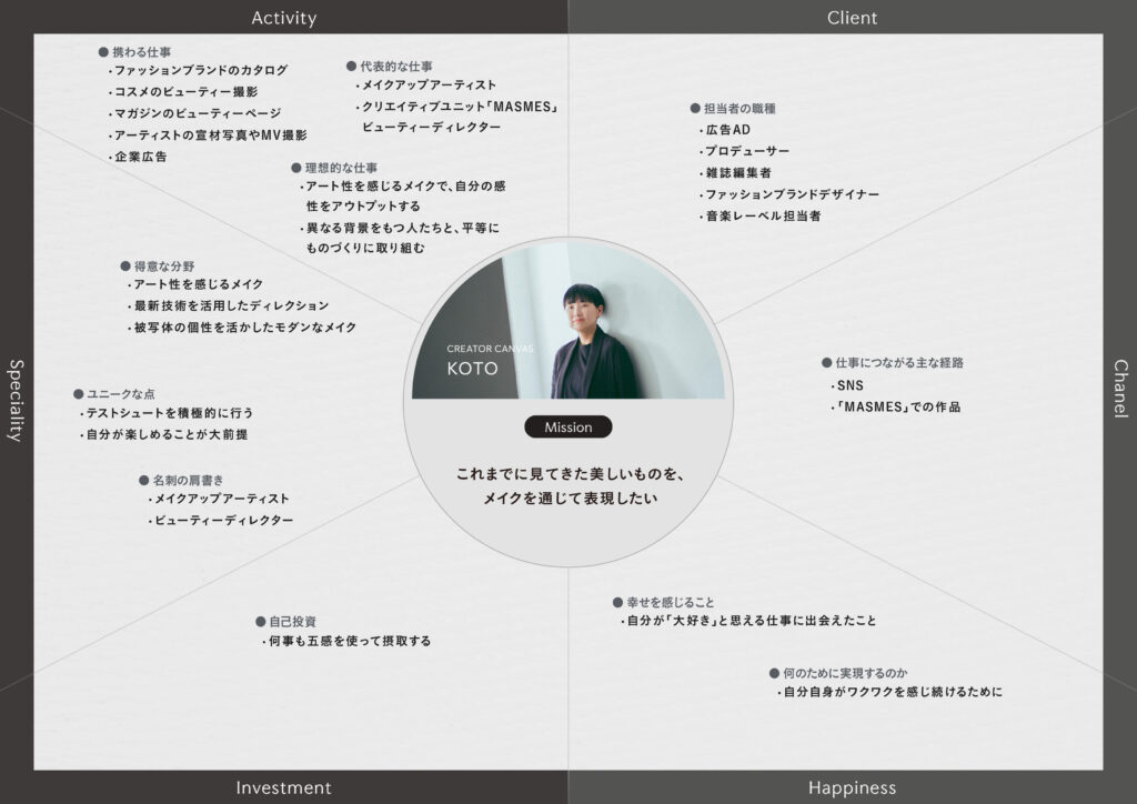 7つの視点から、気鋭のクリエイターたちの活動や価値観を深掘りし、その独自性を浮かび上がらせることで、その人の魅力や使命を体系的に解き明かしていきます。今回は、広告や雑誌などを中心にメイクアップアーティストとして活躍するかたわら、クリエイティブユニット「MASMES」のビューティーディレクターも務めるKOTOさんにお話を伺いました。