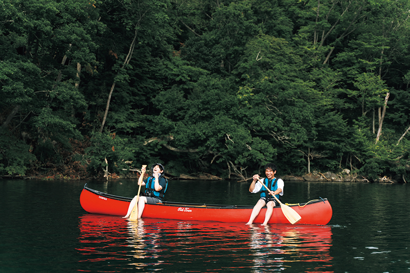 左:夏季限定の屈斜路湖、釧路川源流部のカヌーツアーで使うカナディアンカヌー。ガイド1名+ゲスト2名ほどが乗れる長さ。「オールドクラシックなシェイプで自然に馴染みやすいカヌーです。僕のお客さんは野鳥を眺めたり、写真を撮ったりされる方が多いです」(鑓野目)。