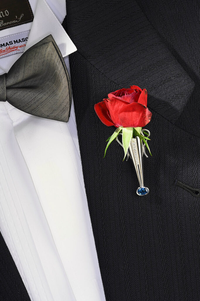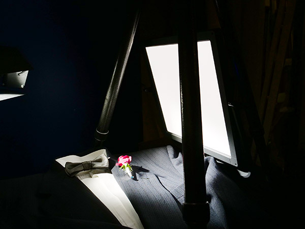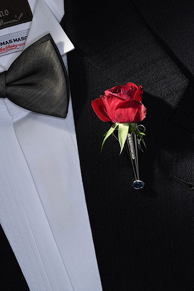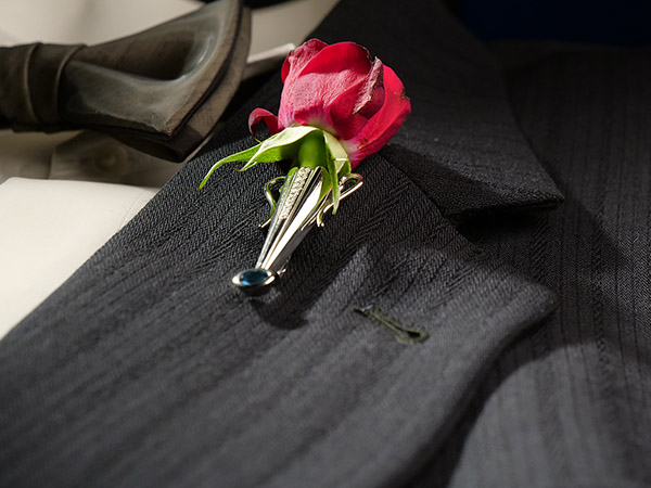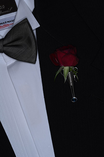 小さなバラの花を刺し、タキシードにつけて、俯瞰から撮影。