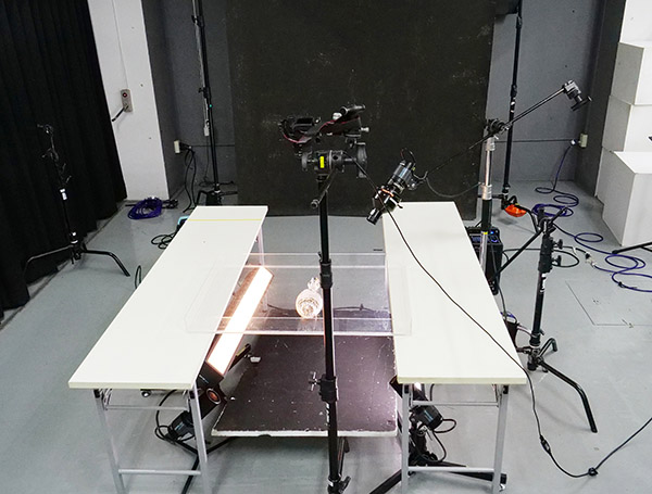 左の水槽下にはスヌート・グリッドをつけた小型ストロボと長さ120cmのストロボバーライトをセット。