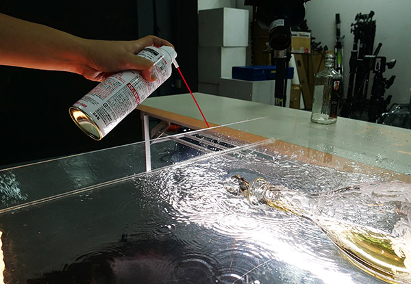 このライティング状態で水槽に水を入れて、エアスプレーで飛沫を作り撮影。