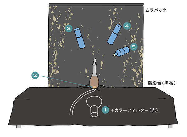 赤のカラーフィルターを掛けたライト❶を、撮影台の向こう側から