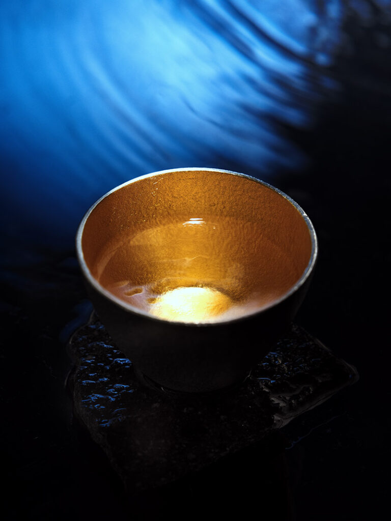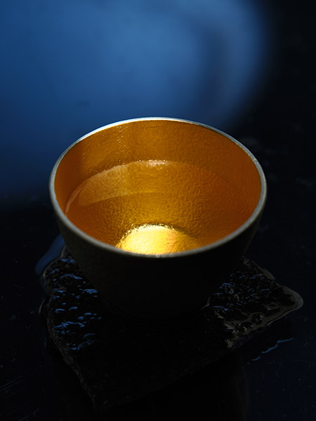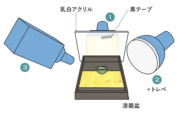 この1灯で、漆器盆のグラデーション、杯の描写、杯を透過した光の映り込みがほぼ完成。