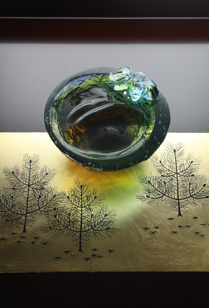 琉球ガラスの緑を透過して味醂の琥珀色を盆に映し込む。