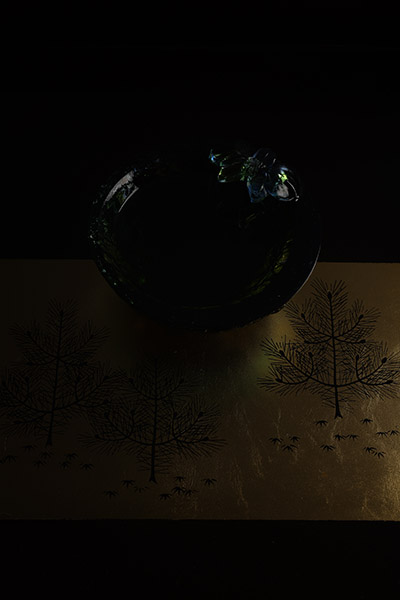 光沢のある黒漆器の盆にフラットな面光源をあてると、