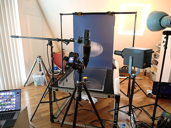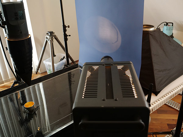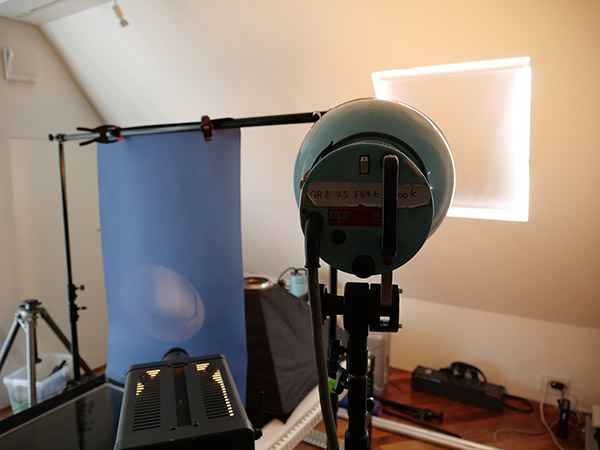 右手からのスポットライトと標準リフレクターライトは、後ろに吊るした濃紺のペーパーに向けて打っている。