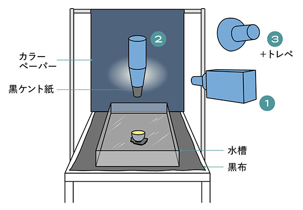 濃紺のカラーペーパーにスポットライト❶をあてて、その反射を水面に映し込む。