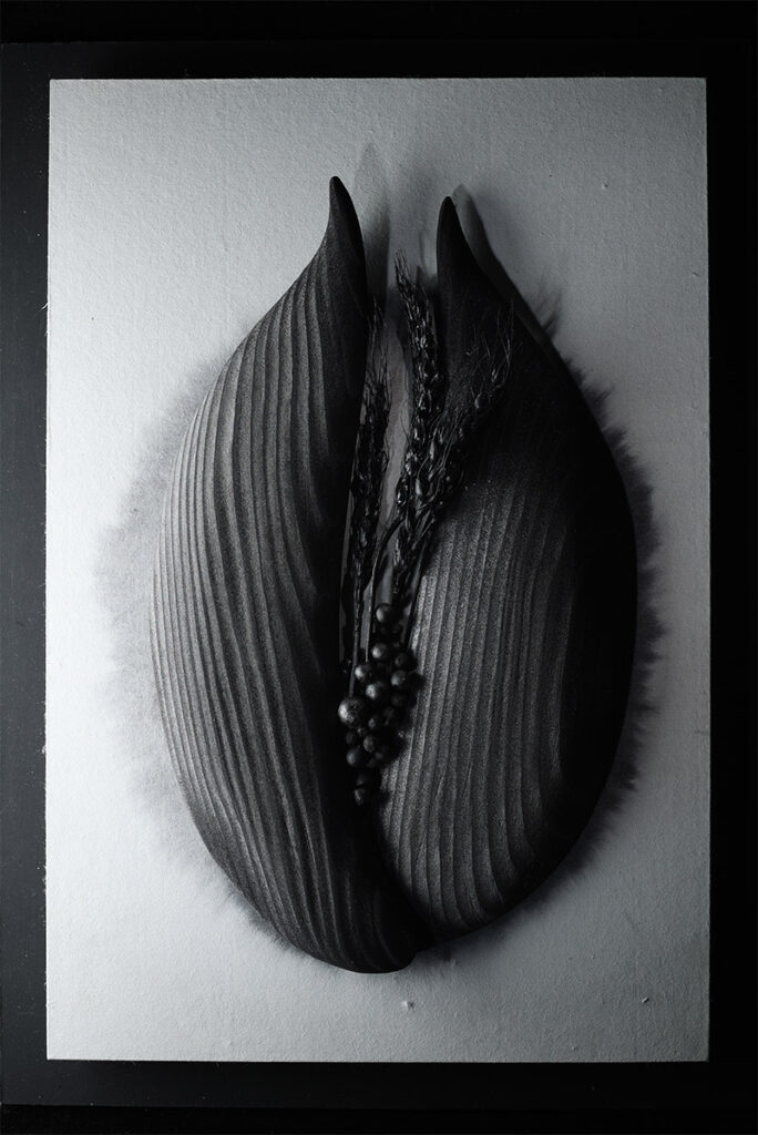 植物の「炭」でできた立体造形の「黒」を撮る