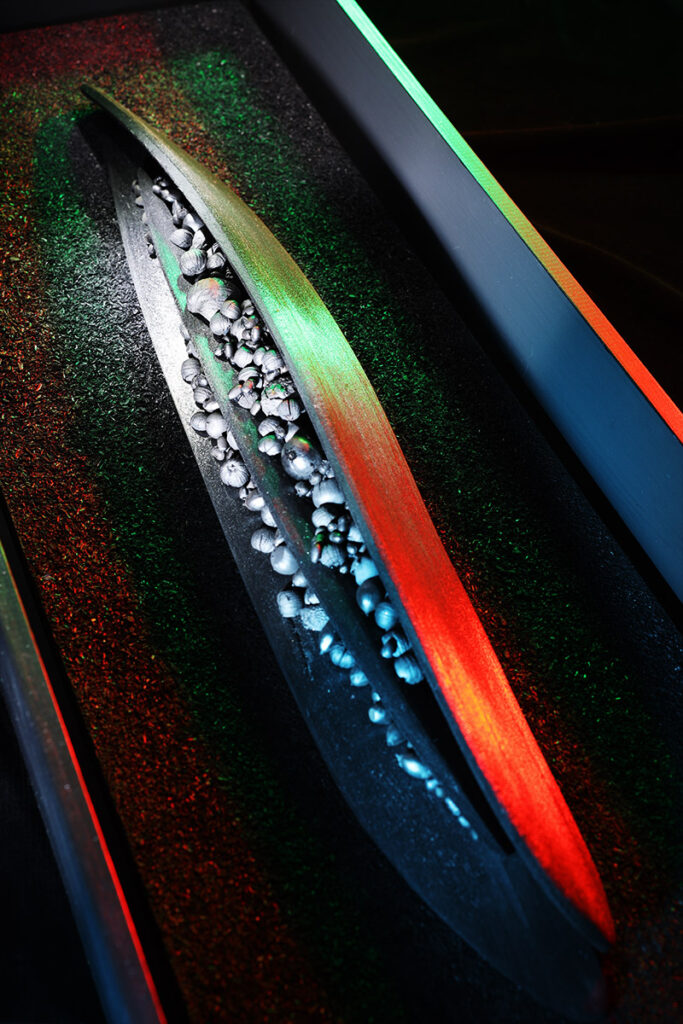 黒い木の箱に収められている。種が詰まったサヤようにも、船のようにも見える。