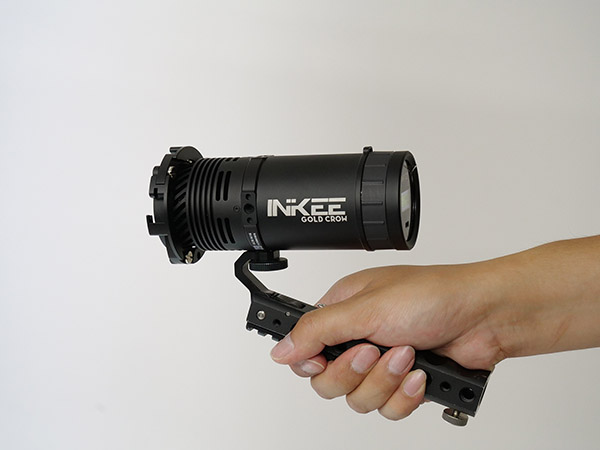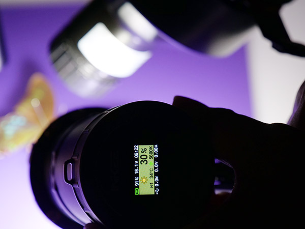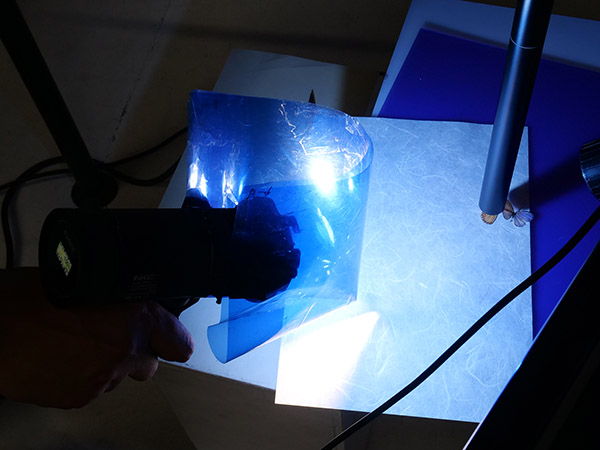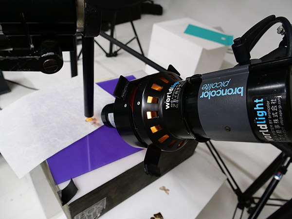 しかし今回は接写撮影なので、出力を絞り、ブルーのフィルターを重ね掛けして光量を落としている。