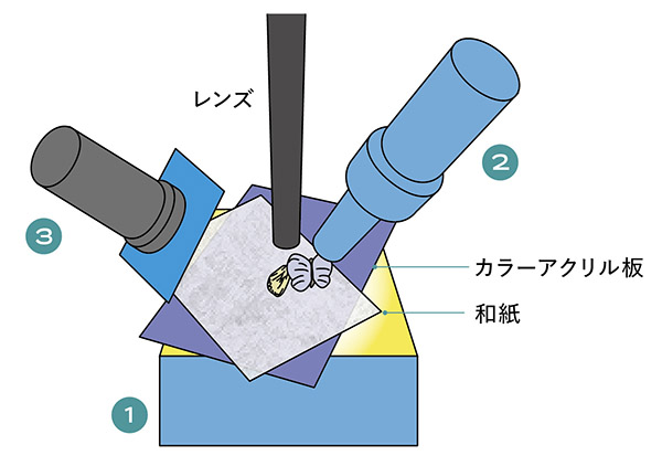 手持ちLEDライトの3灯ライティング。撮影台にしたボックスライトは発光させていない。