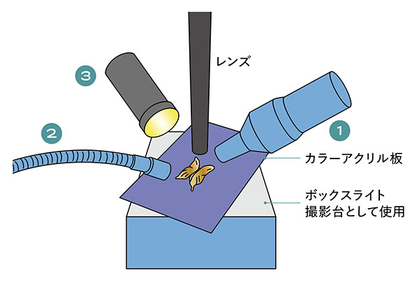 ボックスライトの乳白アクリル面に、青紫の半透明アクリル板と和紙を敷き、蝶の翅を置いて俯瞰撮影。