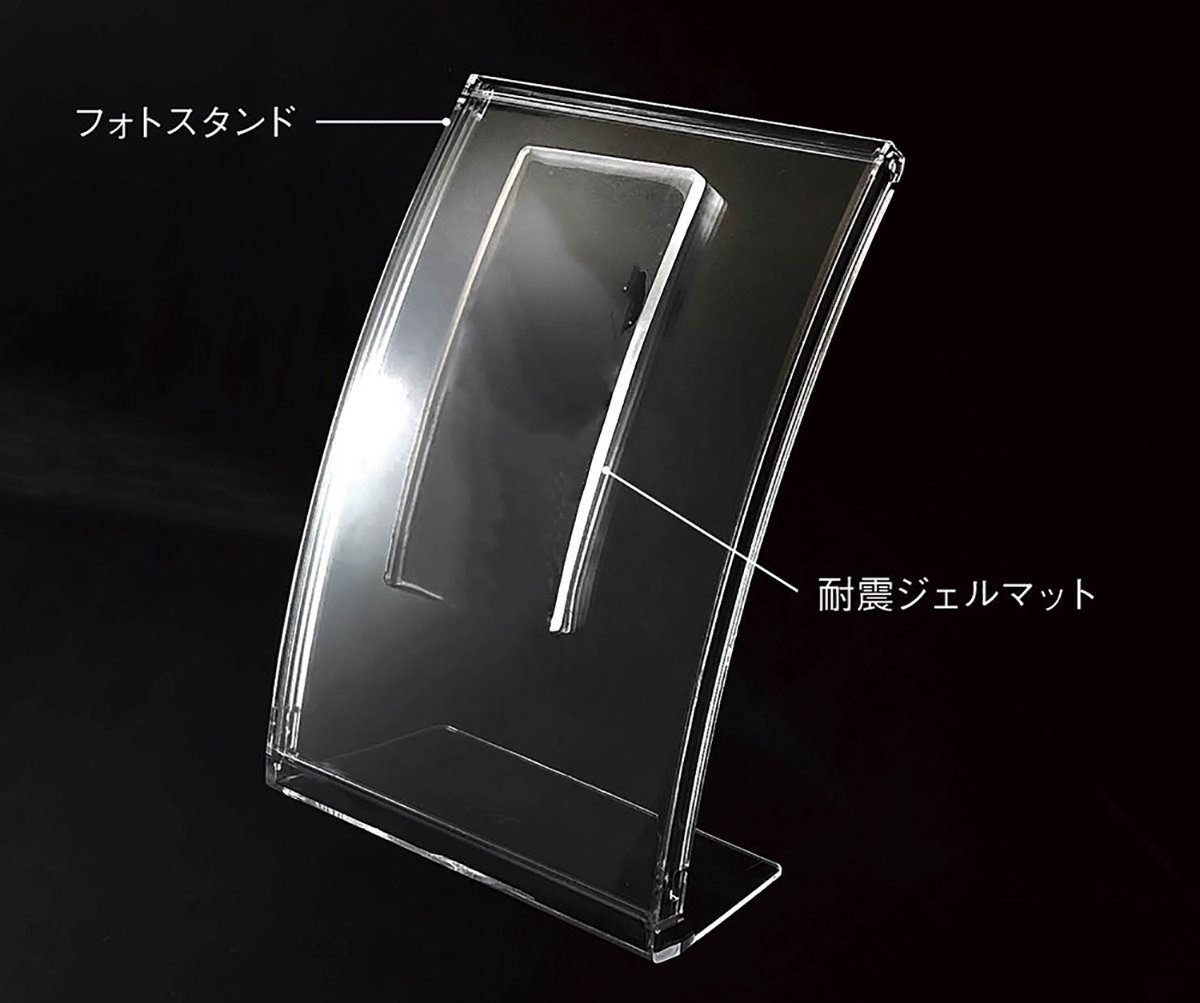 アクリルフォトスタンドに耐震マットを貼った状態。耐震ジェルマットは両面に粘着力があり、被写体を固定しやすい。